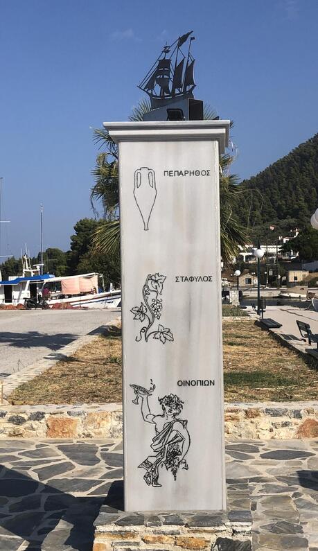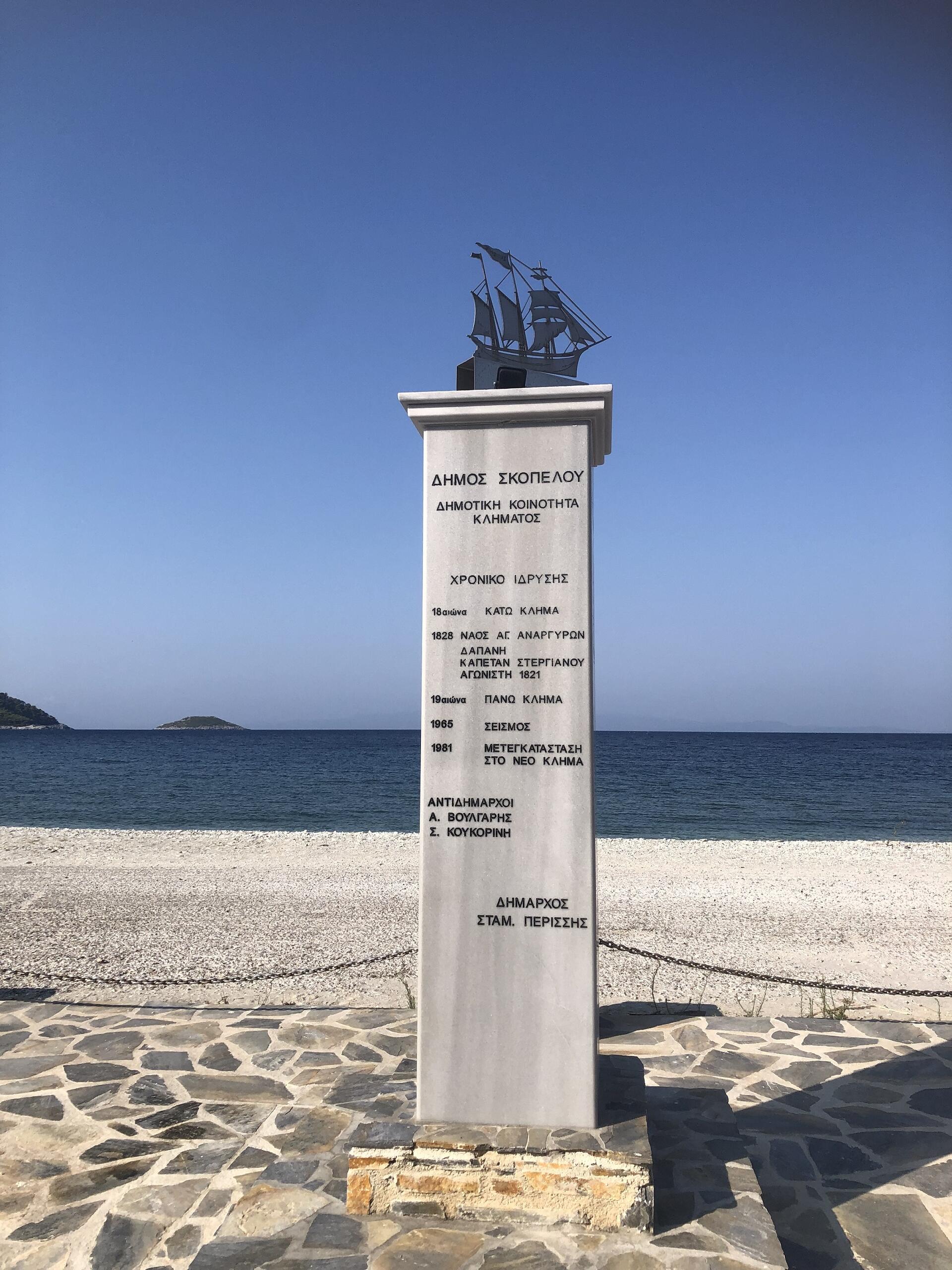 Στον τουριστικό λιμένα του Νέου Κλήματος δεσπόζει η εντυπωσιακή αναθηματική στήλη, ένα έργο που υλοποιήθηκε από το Δημοτικό Λιμενικό Ταμείο Σκοπέλου με πρωτοβουλία του Προέδρου κ. Άγγελου Ξηντάρη, επί δημαρχίας του κ. Σταματίου Περίσση.