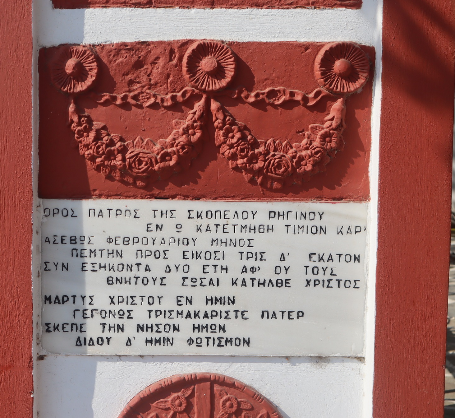 Το εικονοστάσι είναι αφιερωμένο στην μαρτυρική θυσία του Επισκόπου Ρηγίνου, ο οποίος αποκεφαλίστηκε στο σημείο μαζί με άλλους 40 Σκοπελίτες γιατί παρέμειναν αμετακίνητοι στην πίστη τους, στις 25 Φεβρουαρίου του 362 μ. Χ.