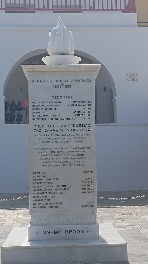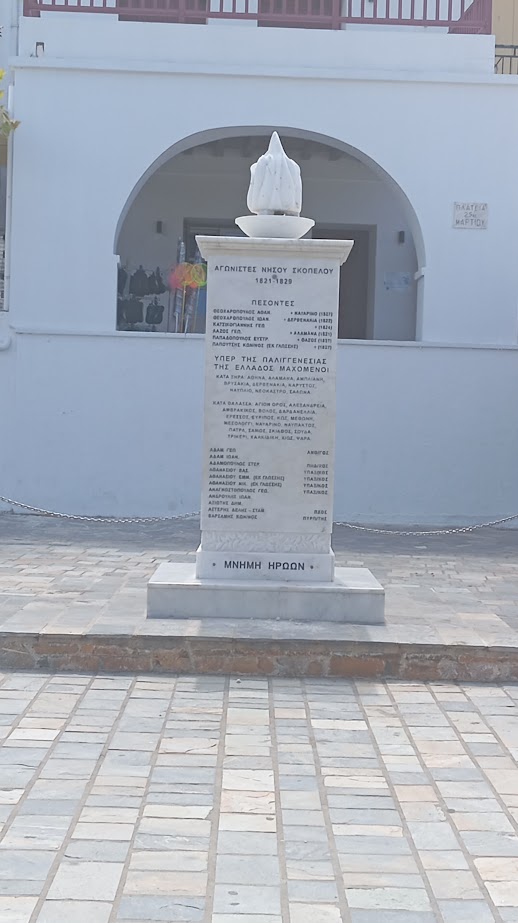 Στις τέσσερις πλευρές του μνημείου είναι χαραγμένα τα ονόματα των Σκοπελιτών που έδωσαν τη ζωή τους για την Ελευθερία, τόσο στη στεριά όσο και στη θάλασσα, καθώς και του Ζαχαρία Παναγιωτίδη, ο οποίος εκπροσώπησε τη Σκόπελο ως πληρεξούσιος στην Α’ Εθνοσυνέλευση. Το έργο αυτό αποτελεί φόρο τιμής και αιώνιας ευγνωμοσύνης προς όσους συνέβαλαν με θάρρος και αυταπάρνηση στον εθνικό ξεσηκωμό.