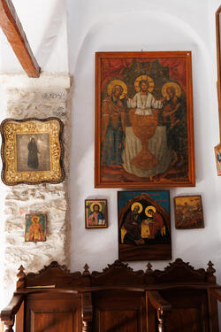 Στο καθολικό, που αντιγράφει την αγιορείτικη αρχιτεκτονική, μπορεί κανείς να δει ένα αξιόλογο παλαιό τέμπλο, καθώς και εικόνες, ανάμεσά τους έργα του περίφημου Κρητικού αγιογράφου του 17ου αι. Αντώνιου Αγοραστού ενώ η εκκλησία διαθέτει λιθόστρωτο πάτωμα.