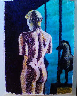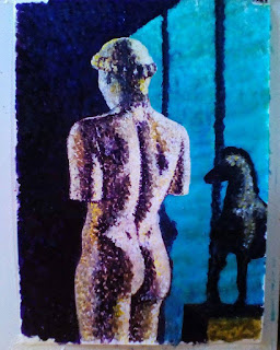 Ζωγραφίζει με πυρογράφο πάνω σε ξύλο, χρησιμοποιώντας καφέ ως χρωστική, αλλά ζωγραφίζει και με ακρυλικά, υδατοχρώματα και άλλα μέσα. Παράλληλα, εμπνέεται από την τοπική ιστορία και τους λαϊκούς μύθους της Σκοπέλου, τους οποίους εικονογραφεί με μοναδική ευαισθησία.