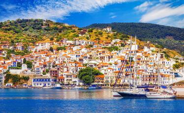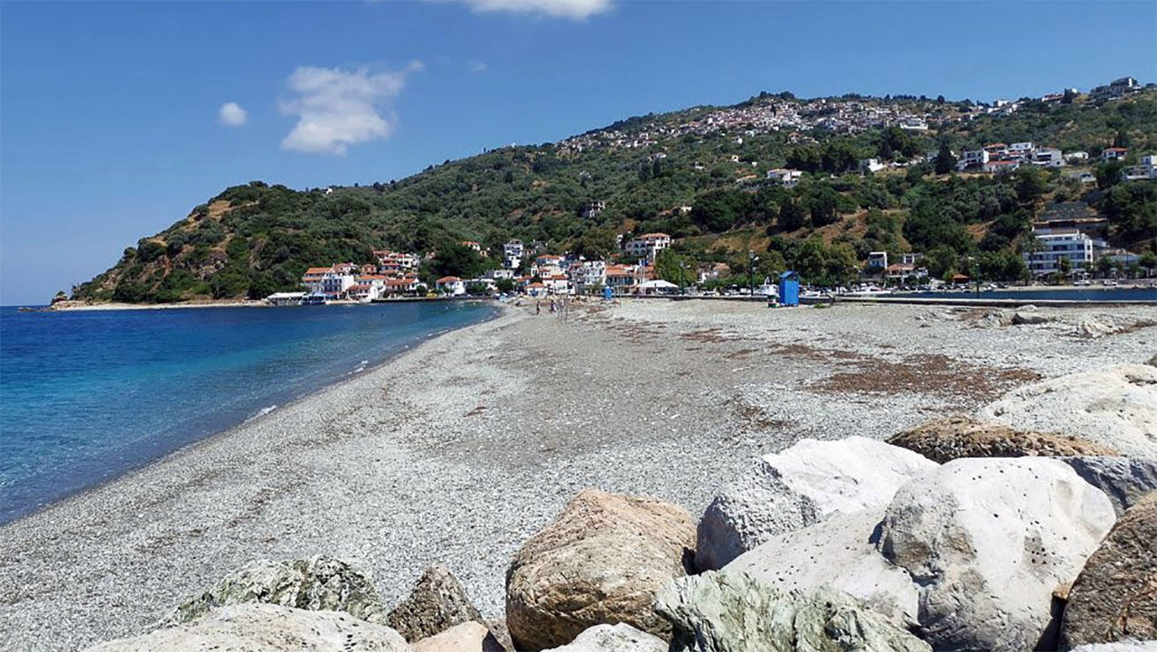 Η σχετικά μεγάλη παραλία στην εξωτερική πλευρά του μικρού λιμανιού του Λουτρακίου της Γλώσσας. Είναι στρωμένη με βότσαλα που χαρίζουν μοναδική διαφάνεια στα καταγάλανα νερά.